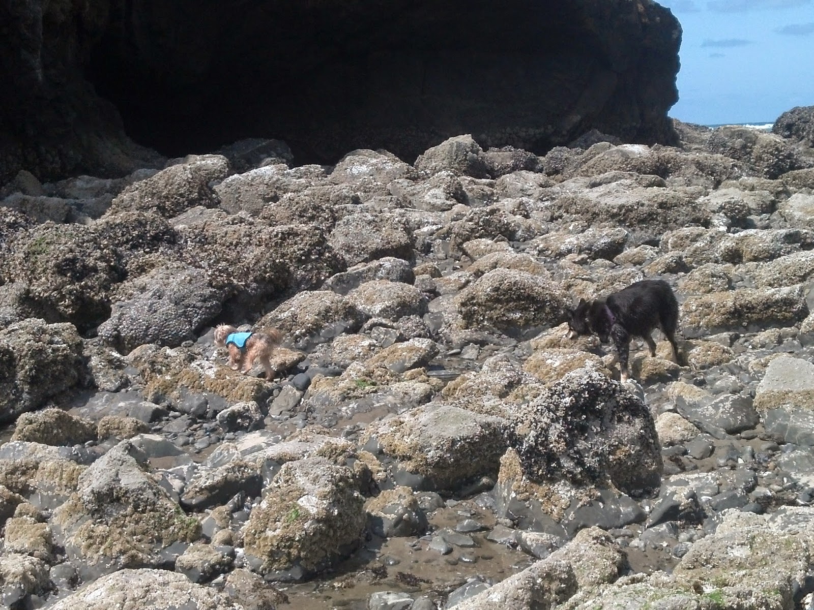 The dogs had to be leashed around Haystack Rock to protect the plants and animals living in the tide pools.