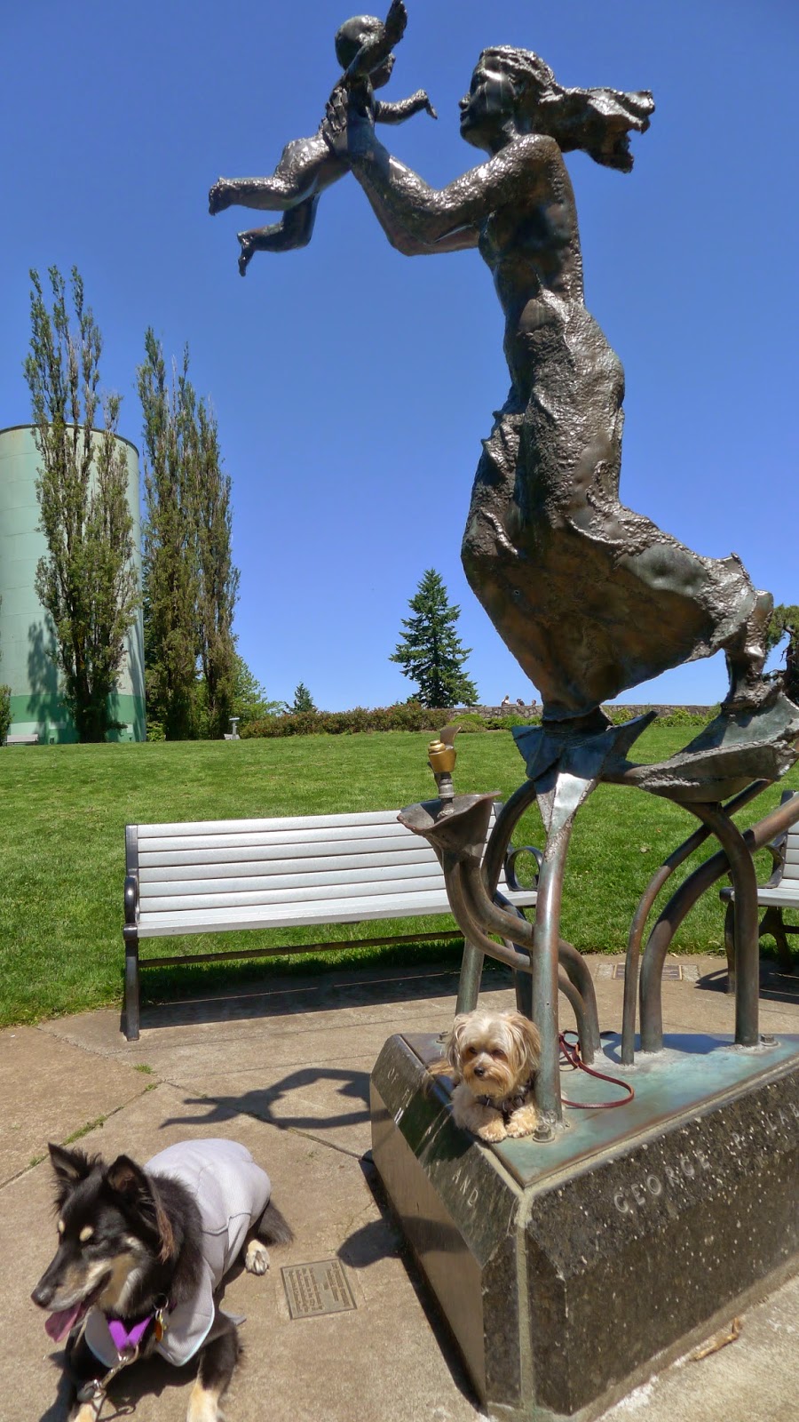 The dogs with the mother and child statue and water fountain by Frederick Littman. It was stolen once then found during a narcotics raid ten years later and returned to the park.