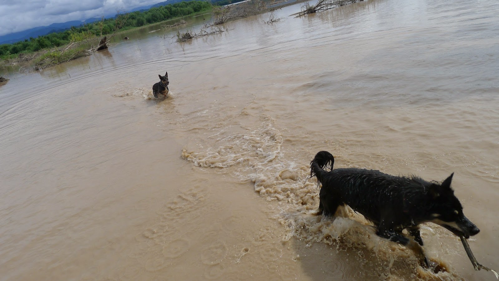 It was a hotter-than-predicted day so all three dogs were panting by the time we reached the river. Sage and Mort quickly remedied that by plunging into the river which was an attractive chocolate milk color that day.