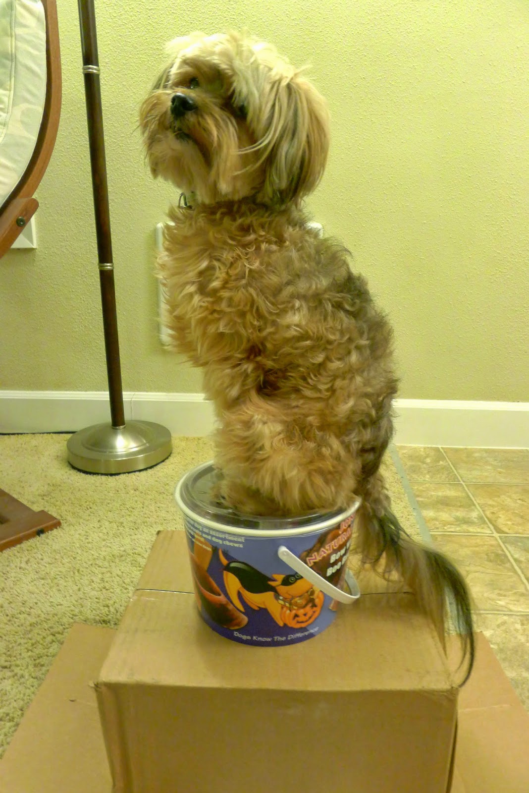 I admit to giving Mr. N a "paw up" with that particular pose. He'll jump on top of the box on cue but it's a little unwieldy without practice to jump up on the bucket as well.