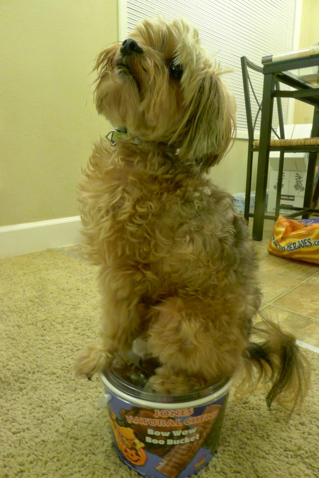 And then you can expand into all sorts of other props and behaviors. Like sitting on top of the Boo Bucket that Mr. N won from Jones Natural Chews. Warning: this is not recommended for dogs just learning to shape. The bucket still has all the treats in it and dogs may decide to just tear the lid off and graze on all the treats instead of working.