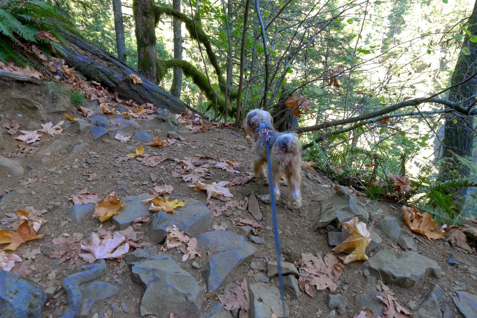 The trail was extremely rocky and the humans had to concentrate on where to step. The dogs didn't care. The advantage of being steady on four paws.