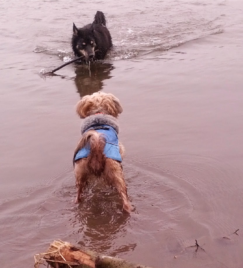 Mr. N is not big into toys and he normally leaves other dogs' toys alone. With Sage though, he is merciless about stealing her toys. He'll even wade into water which he normally avoids to make sure the stick/ball/other item doesn't make it to shore without him.