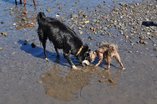 It doesn't matter how big the stick. Mr. N still snatches it and runs away. In this case, he almost whacked Sage in the head with it. He never steals anyone else's toys but he and Sage play this long convoluted game where Sage fetches the stick and drops it at the shoreline when Mr. N gives her a look and then runs away with it. We then have to play tug to get it back to throw it for Sage and the cycle begins anew.