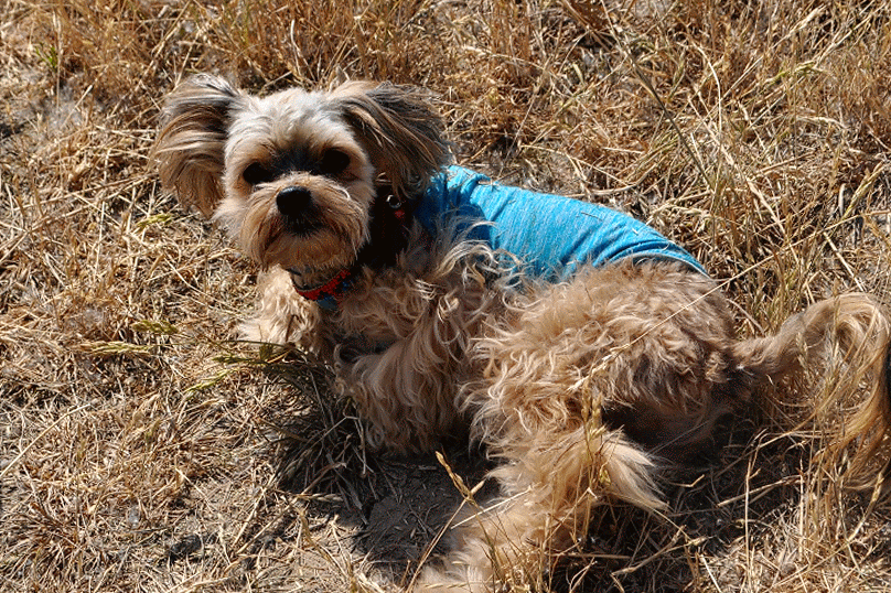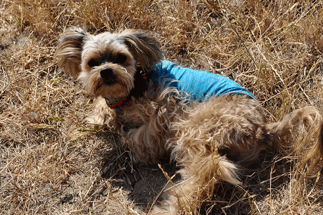 I probably would not put it on him in triple digit weather (or go out for that matter!) but in lower high temperatures, it didn't seem to make him warmer. We were out in the sun for three hours this hike. This will be a welcome addition to his summer wardrobe and I'll have to research some pet sunscreens for his face.