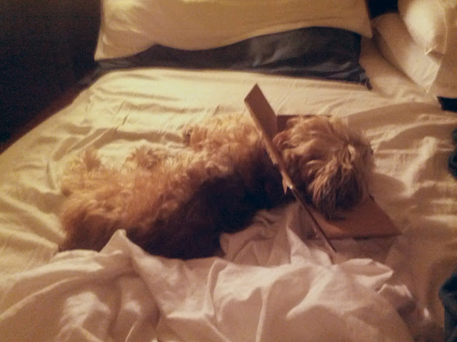 So I googled and one website suggested putting a paper plate on small dogs. Didn't have those either. I looked around and spotted a cardboard box and cut that up. Mr. N didn't mind too much as the cardboard was fairly flexible and went back to sleep. The next day, I borrowed a real cone from a friend.