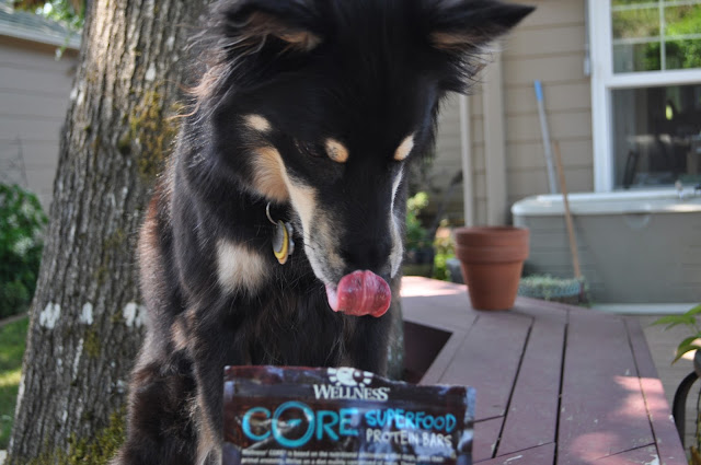 The Wellness CORE Grain-Free Protein Bars Salmon & Whitefish with Pomegranates from Chewy.com remind me a lot of protein bars for humans texture and size and shape-wise. All of the ingredients are easily recognizable, they're made in the USA and contain no meat by-products, grains or artificial flavors, colors or preservatives. However, they're a little too hard and not breakable enough to use for training easily. And Mr. N can eat one pretty rapidly so they're not long-lasting.