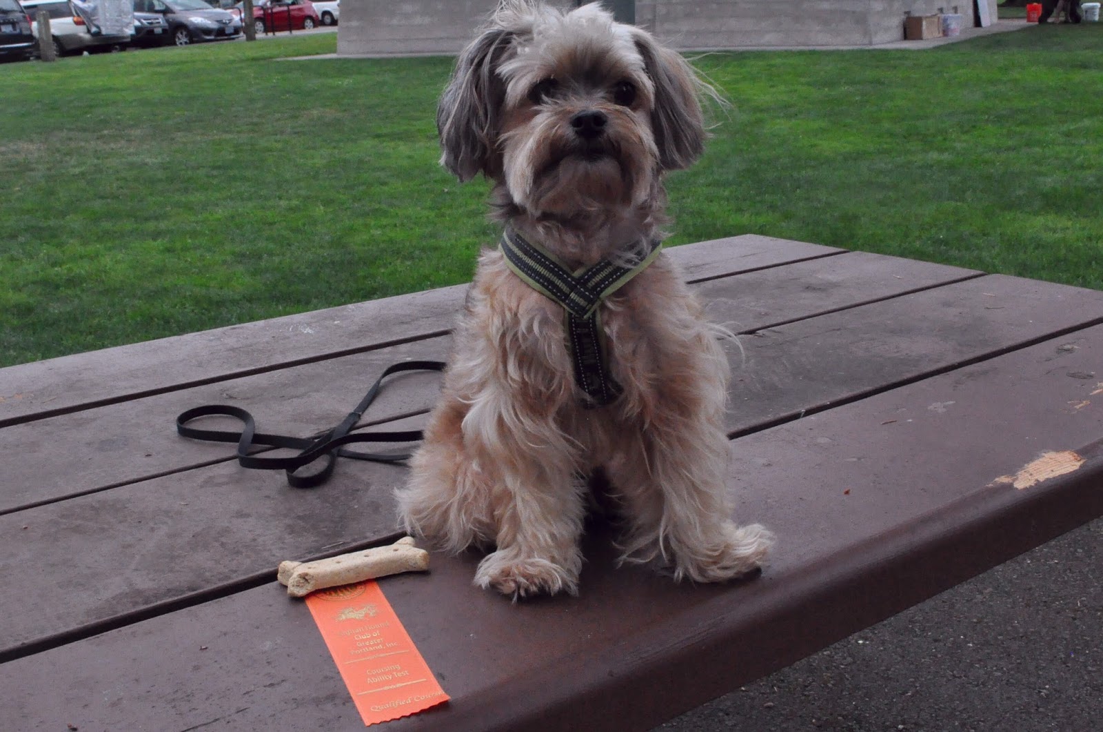 Mr. N posing with his ribbon and the giant Milkbone that he won. Mr. N wants to go back to the field now. |
