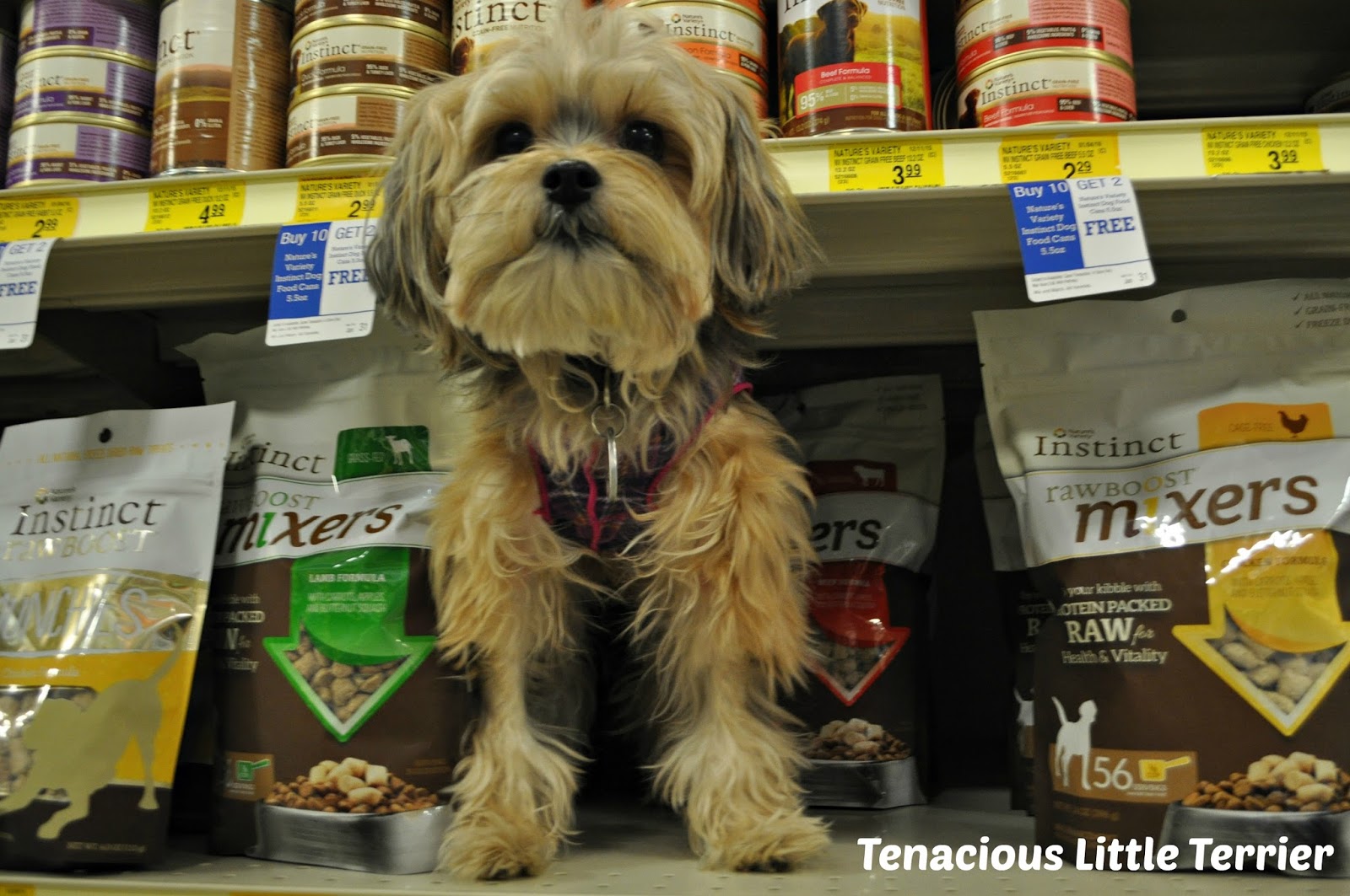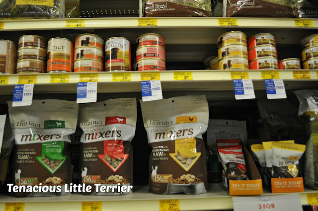 At Petsmart, Mr. N's nose led him right to the raw food section. The Raw Boost mixers are located with the other Instinct products, next to the freezer. It comes in three different sizes (1 oz, 6 oz, 14 oz). The trial-sized bags are great for picky pups like You-Know-Who and are 1.99 each or 3 for $5. The large bags are currently on sale for 20 percent off. The protein choices include chicken, beef, turkey and lamb for dogs and rabbit and chicken for cats. We picked up a bag of the lamb for Mr. N. I like to rotate proteins as much as possible and lamb is the hardest out of those to find.