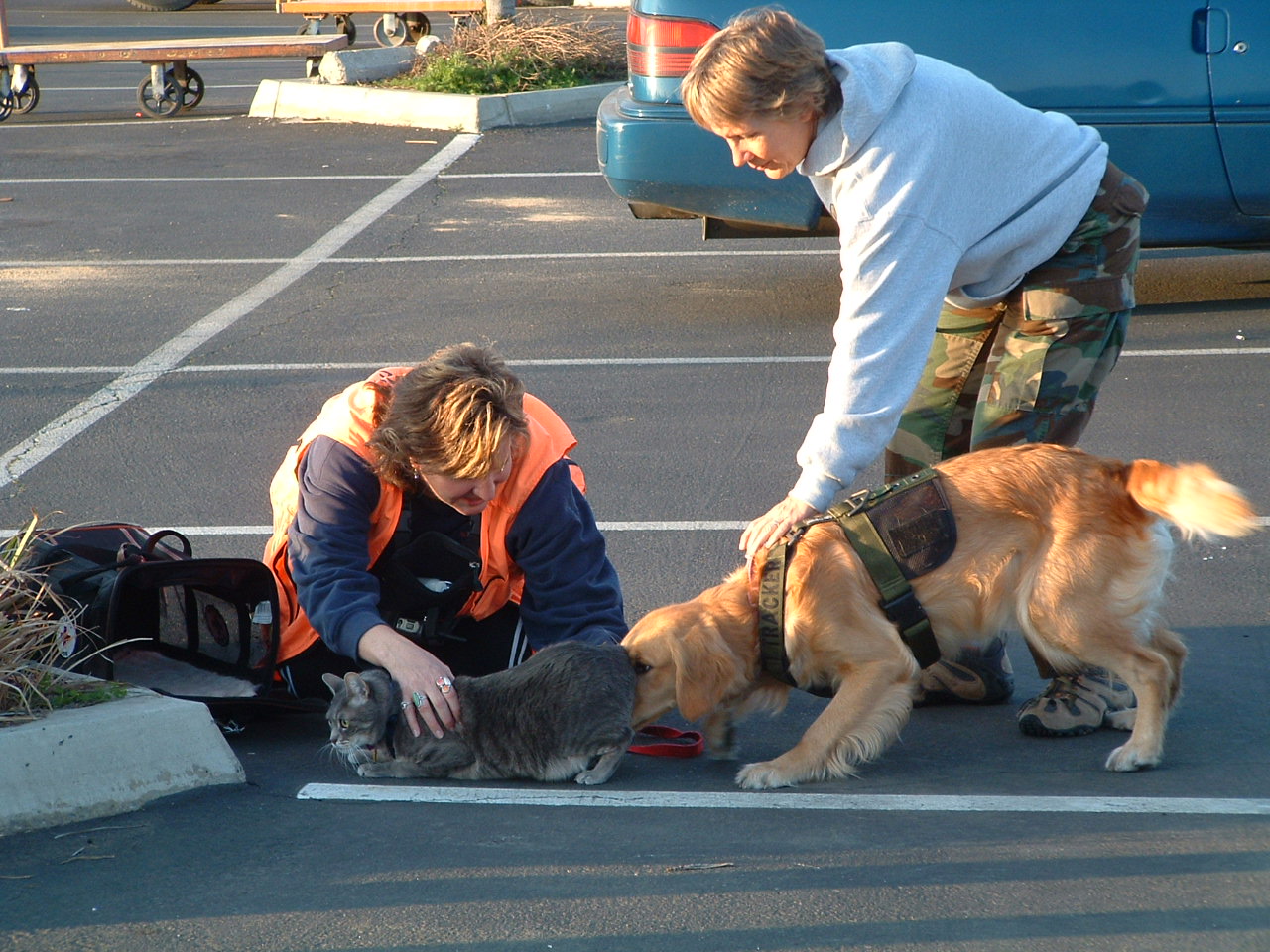 | Trainer Kat Albrecht introduces MAR Cat Detection Dog in training to Target Cat Myron. |