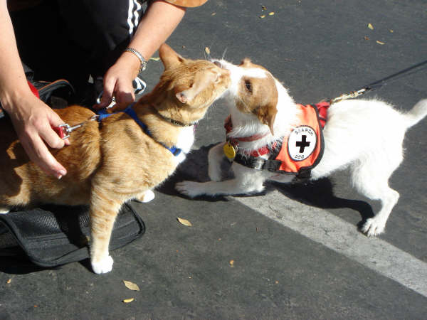 MAR Cat Detection Dog Susie greets Target Cat Cheeto with a kiss.