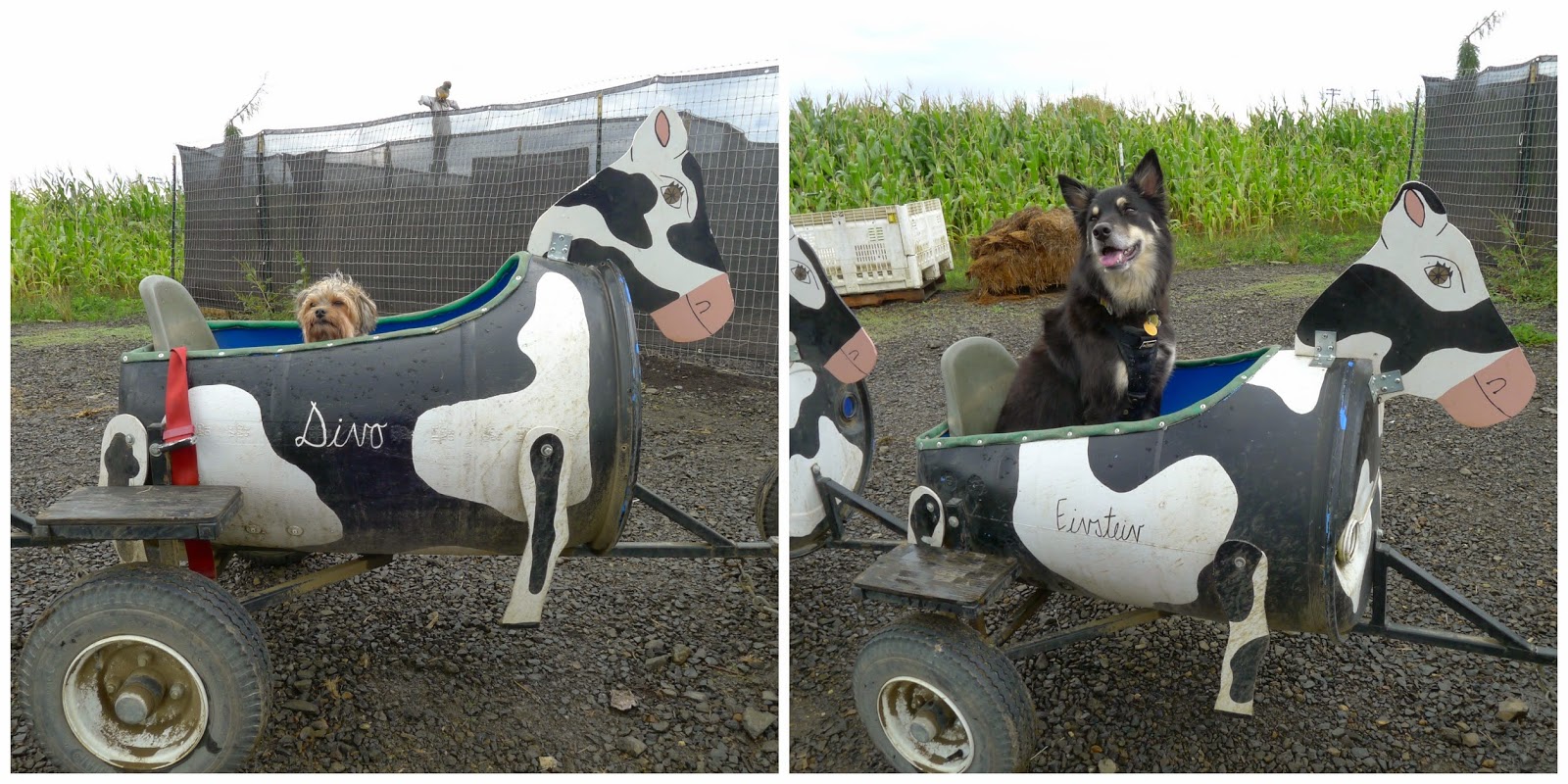 We also toured other parts of the farm. We stopped to take pictures of the dogs on the hay wagon and the cow carts. The cows all had names like Butters, Alfafa, Dairy etc. There were two cows that were named Einstein and Divo right next to each and we couldn't resist.