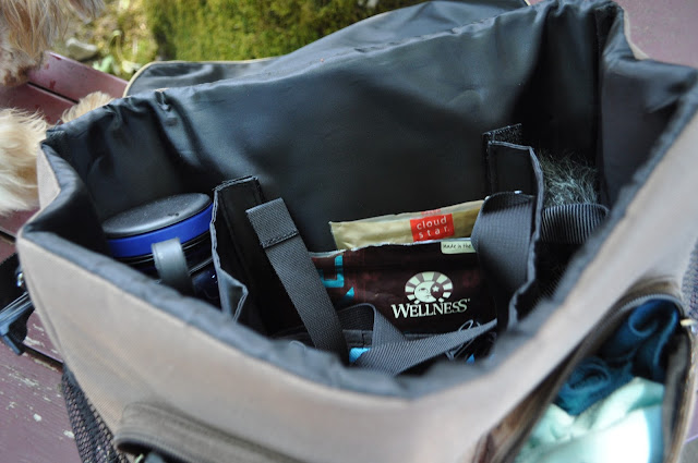 Going places with Mr. N is akin to going places with a baby. So much additional stuff to haul around. Especially when we're going to training class or Mr. N's therapy dog sessions. I'm pretty sure all his gear and treats and things weigh about as much as Mr. N does. I constantly tell Mr. N if he was any bigger, I'd make him wear a backpack and carry some of his own things.