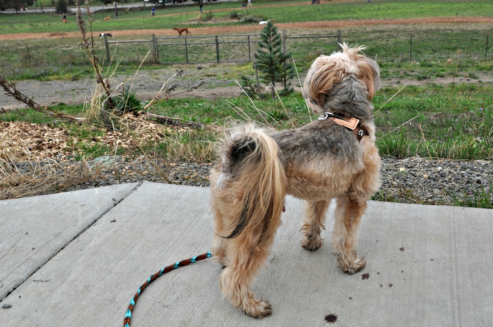 | Mr. N knows he did a good job by looking at the other dog and not reacting. He thinks he deserves his treat now. |