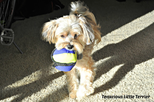 Mr. N has very little interest in balls but once he saw that the ball had food in it, he was much more willing to go chase after it and bring it back to be opened. He will retrieve but usually he finds it boring after a half-dozen throws.